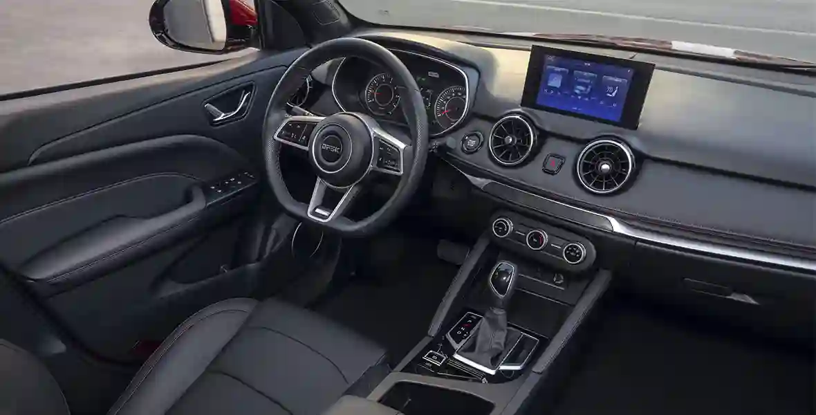 Интерьер кроссовера отличается выверенной эргономикой, качественной и практичной отделкой салона. Сиденья DFSK 500 обшиты экокожей с перфорацией и красной прострочкой. Сиденья регулируются в шести направлениях для водителя и в четырех – для переднего пассажира. Уже в базовой комплектации городской кроссовер располагает набором всех необходимых опций, таких как: обогрев передних сидений, бесключевой доступ, кондиционер, круиз-контроль, датчик света и камера заднего вида. За развлекательные функции отвечает мультимедиа с сенсорными 7” экраном и опцией подключения мобильных устройств через Bluetooth.