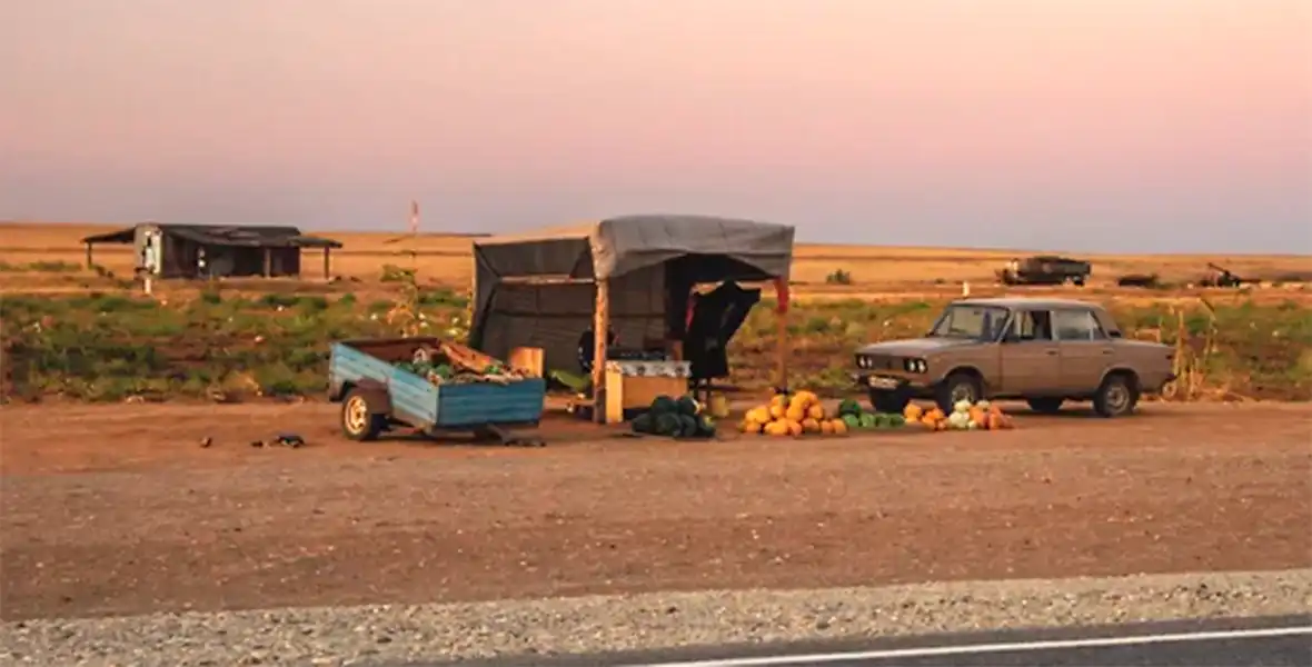 Близ Астрахани много дорожной полиции, дальше взамен настоящих патрулей — картонные муляжи, а в степях пропадают и они. Только небо, только ветер шумно охаживает кузов.