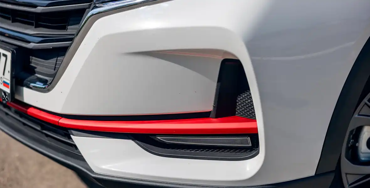 Выглядит он достаточно стильно, модно и очень типично для компактного китайского кроссовера. Уже ставший классическим кузов с эффектом «парящей крыши», трапециевидная облицовка радиатора с темными горизонтальными ламелями. Что приятно – минимум хромированных деталей. В бамперах и черных пластиковых накладках на пороги есть контрастные вставки красного цвета – это, видимо, должно придать образу автомобиля некий элемент спортивности.
